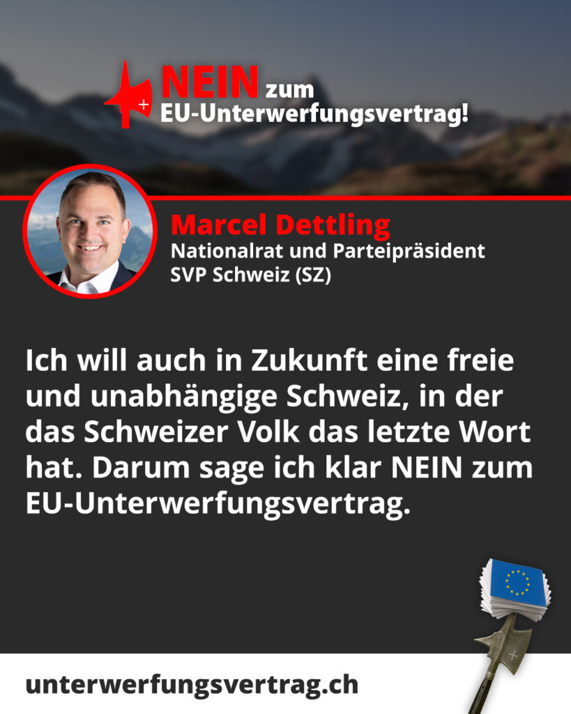 Die Zuwanderung macht uns zu schaffen. Die Mieten explodieren, der Verkehr auf Strasse und Schiene ist überlastet und in unseren Schulen sinkt das Bildungsniveau. Heute können wir die Zuwanderung noch selber steuern. Mit dem EU-Vertrag wird das unmöglich sein. Deshalb NEIN zum EU-Unterwerfungsvertrag!